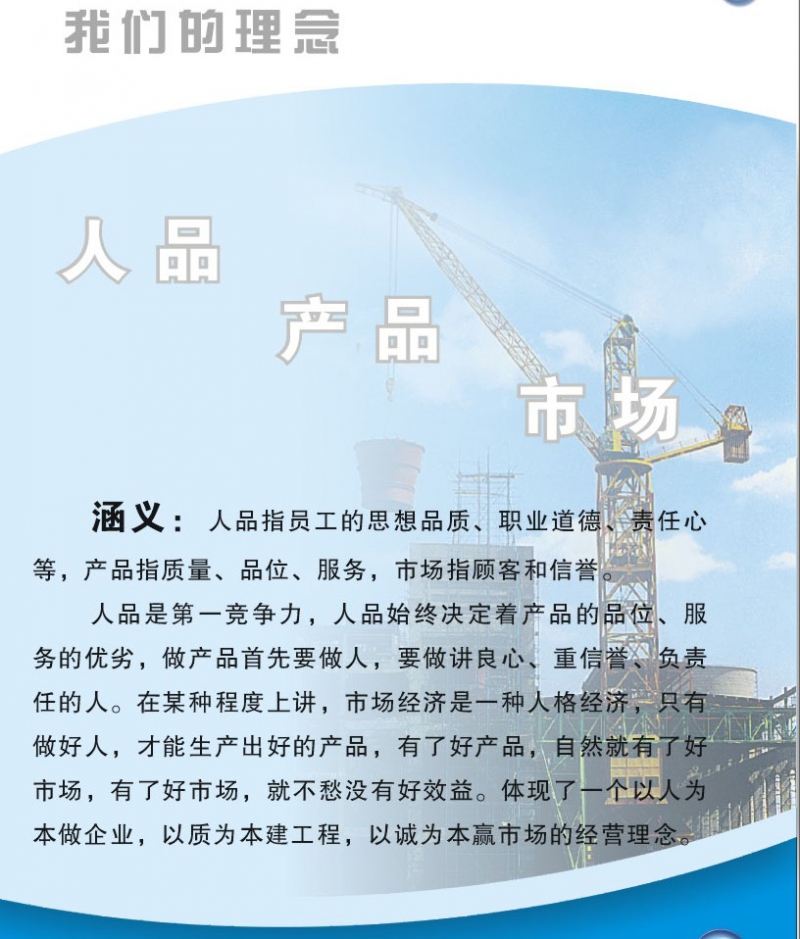 人品是第一競爭力,人品始終決定著產(chǎn)品的品位,服務(wù)的優(yōu)劣,做產(chǎn)品首先要做人,要做講良心、重信譽、負責任的人,在某種程度上講,市場經(jīng)濟是一種人格經(jīng)濟,只有做好人,才能生產(chǎn)出好的產(chǎn)品,有了好產(chǎn)品,自然就有了好市場,有了好市場,就不愁沒有好效益。體現(xiàn)了一個以人為本做企業(yè),以質(zhì)為本建工程,以誠為本贏市場的經(jīng)營理念。