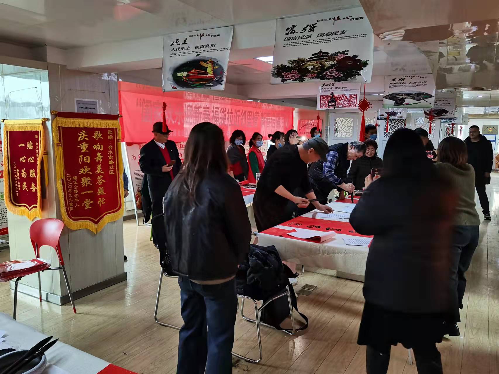 四季青街道合水南路社區(qū)大廳內,伴隨著喜氣洋洋的音樂,書法愛好者們不拘一格、揮毫潑墨,寫下一幅幅新春的寄語。