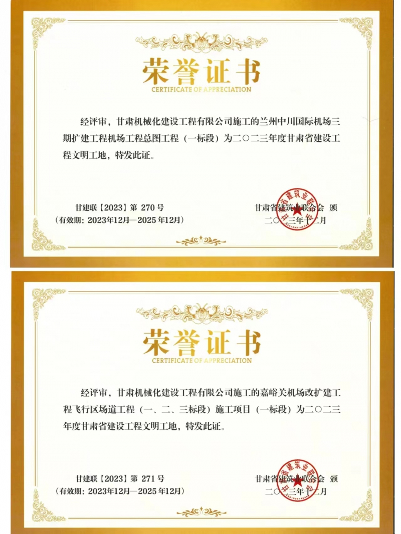 近日,我司承建的蘭州中川國(guó)際機(jī)場(chǎng)二期擴(kuò)建工程機(jī)場(chǎng)工程總圖工程 (一標(biāo)段)與嘉峪關(guān)機(jī)場(chǎng)改擴(kuò)建工飛行區(qū)場(chǎng)道(一、二、三標(biāo)段) 施工項(xiàng)目 (一標(biāo)段) 獲得2023年度甘肅省建設(shè)工程文明工地榮譽(yù)稱號(hào)。