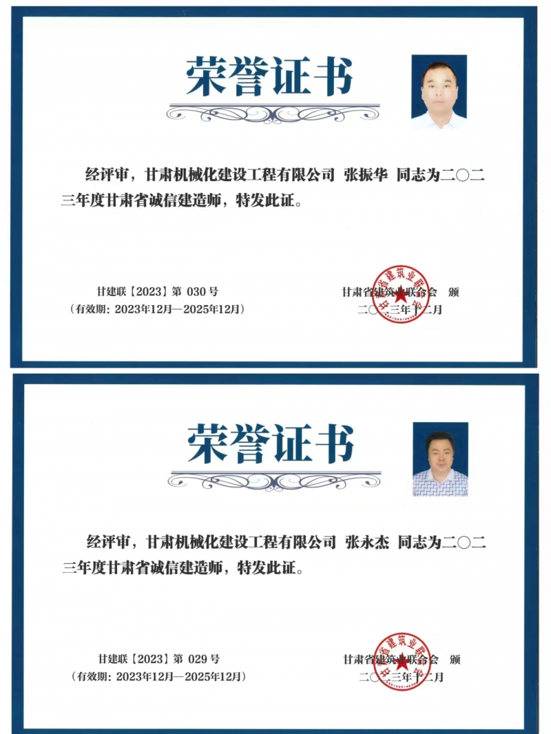張永杰與張振華兩位同志獲得2023年度甘肅省誠(chéng)信建造師榮譽(yù)稱號(hào)。