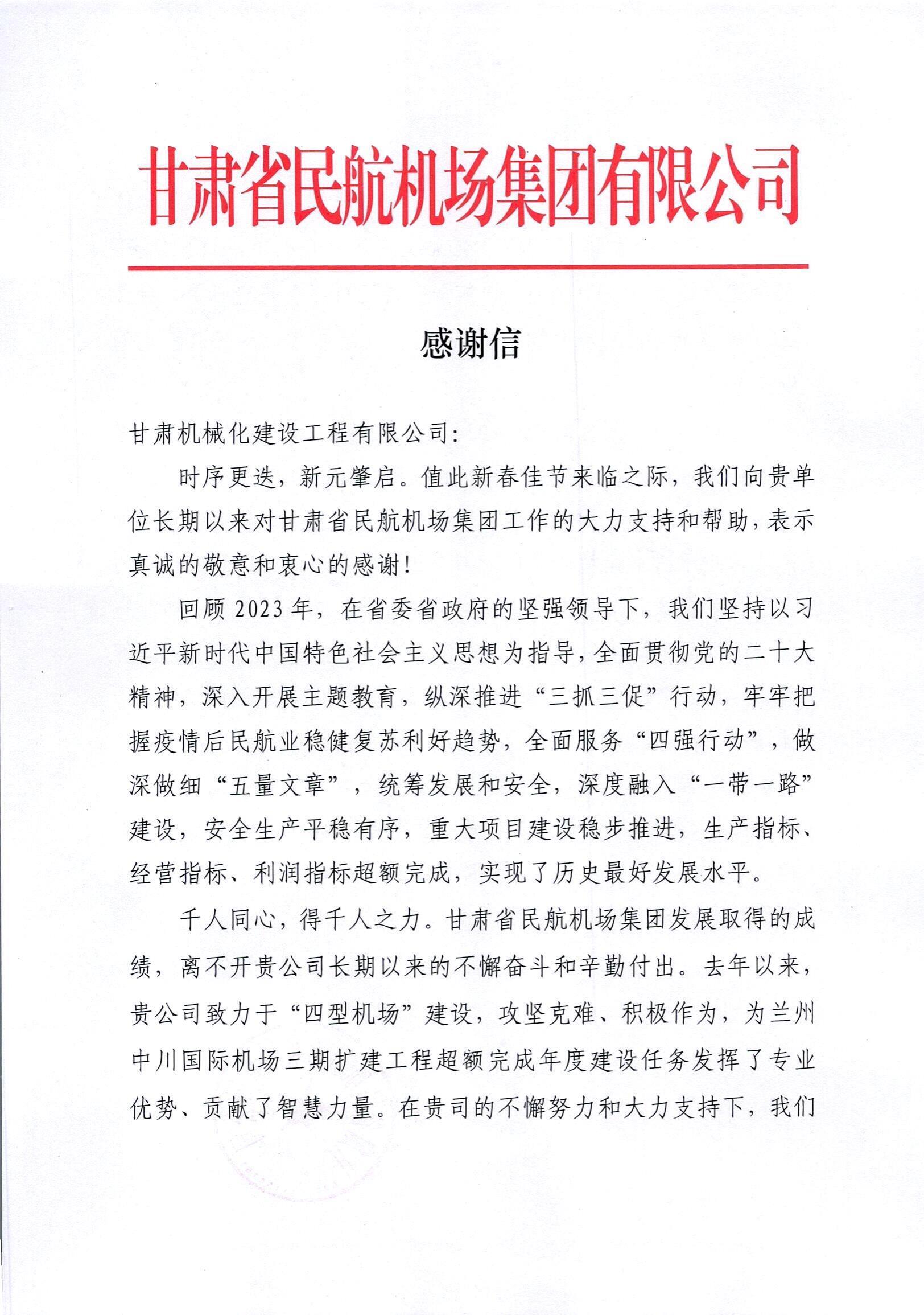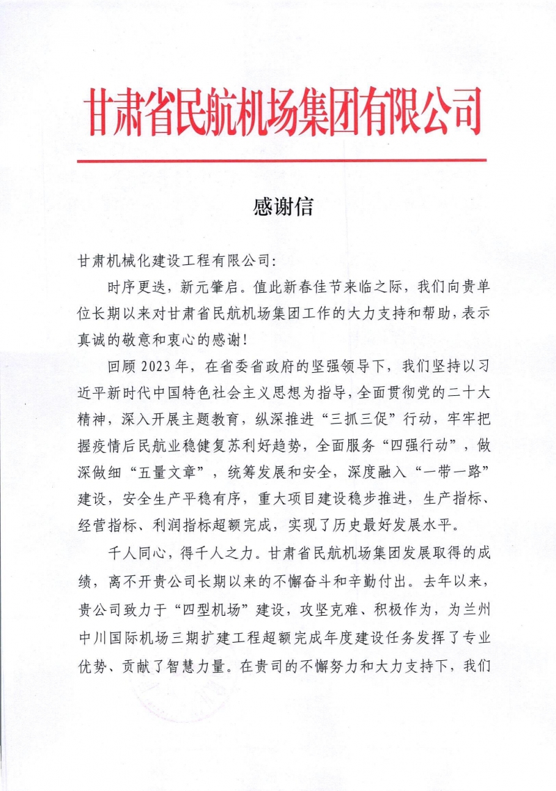 2月8日,新春佳節(jié)來臨之際,我司收到來自甘肅省民航機(jī)場(chǎng)集團(tuán)有限公司的感謝信。