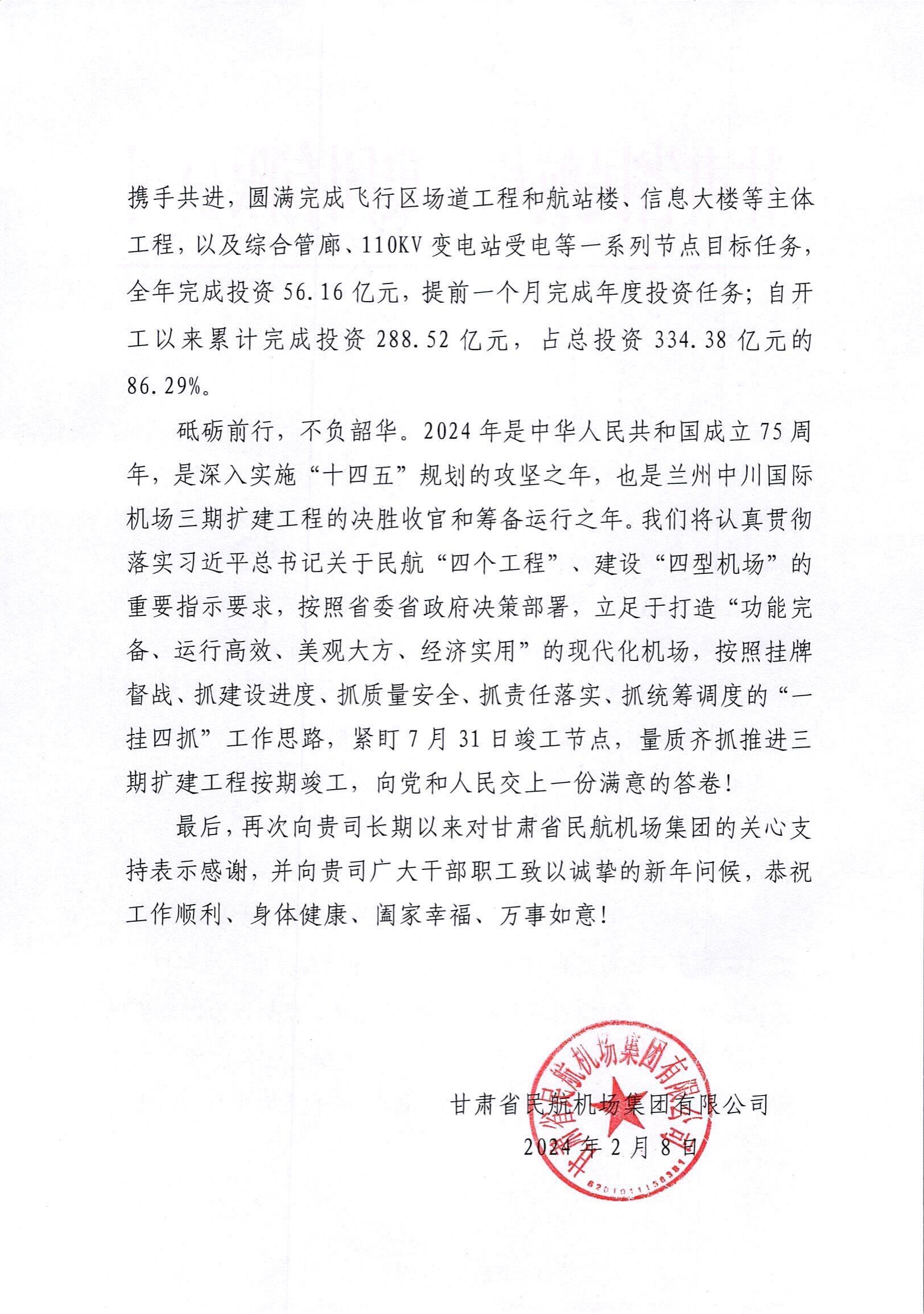 最后,甘肅省民航機(jī)場(chǎng)集團(tuán)有限公司再次向我司長(zhǎng)期以來對(duì)甘肅省民航機(jī)場(chǎng)集團(tuán)的關(guān)心支持表示感謝,并向我司廣大干部職工致以誠(chéng)摯的新年問候!
